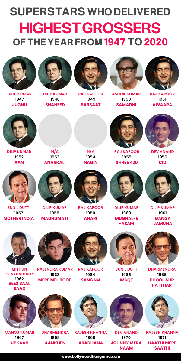 The first 3 years since independence was dominated by the young sensation of that era, Dilip Kumar, who delivered two of the three highest grossers of the year with Jugnu (1947) and Shaheed (1948). His sole competitor in the decade was the showman, Raj Kapoor, with one highest grosser of the year in Barsaat (1949). The three years post-independence marked the rise of two of India’s most iconic superstars till date and as they say, the rest is history.