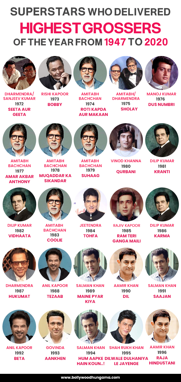 In the first part of highest grosser of the year series, Bollywood Hungama did an in-depth analysis of the actors with maximum highest grossing film of the year spanning 73 years from 1947 to 2020. While Salman Khan was crowned the biggest Bollywood superstar since independence with 10 highest grosser of the year, Dilip Kumar bagged the second spot with 9 films in the list, whereas Aamir Khan was third with 7 films in the list. The top three stars contributed 26 of the total 73 highest grosser of the year, which in percentage terms is 35%. In the second part of the series, we come up with a detailed decade by decade analysis of stars fighting for the top spot in the respective decades. The part 2 is a decade by decade analysis from 1957 to 1989